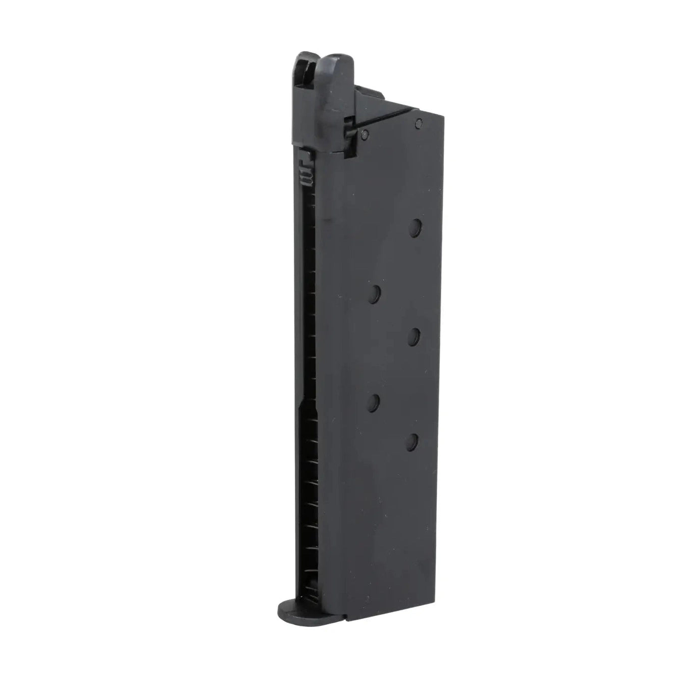 Mainly made of metal, green gas powered magazine for 1911 type replicas from the manufacturer E&C. The model accommodates 22 BBs. The magazine is compatible with replicas from, among others, E&C, TM