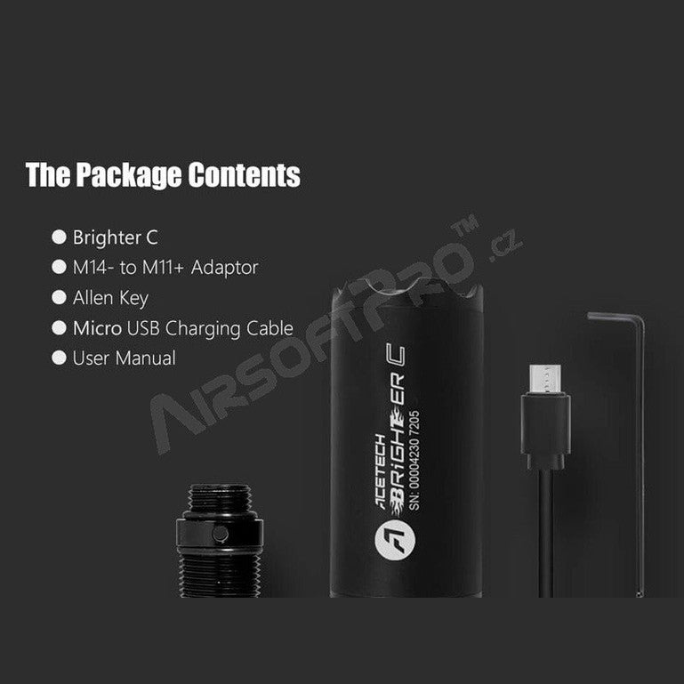 A adaptor from M14(-) thread to M11(+) is included, so you can use the tracer on any airsoft gun that has a detachable flash hider. An allen key is also included for easier tightening / loosening the adaptor.