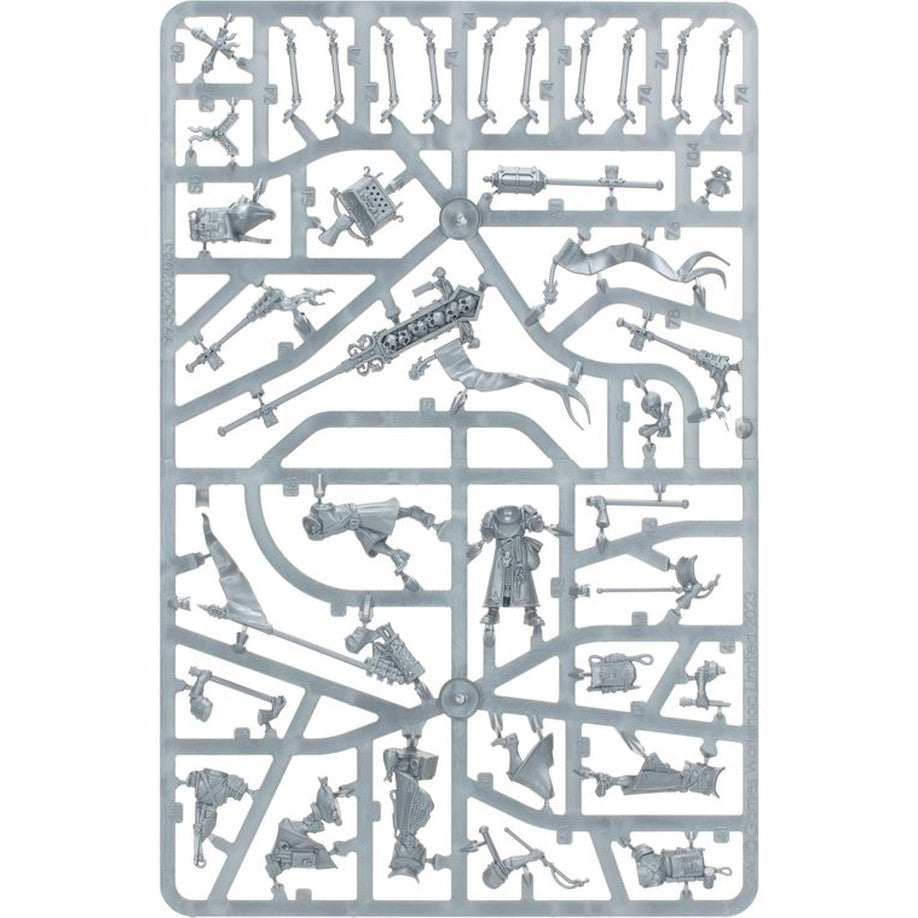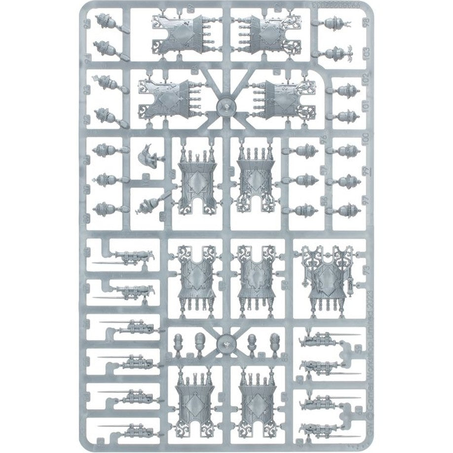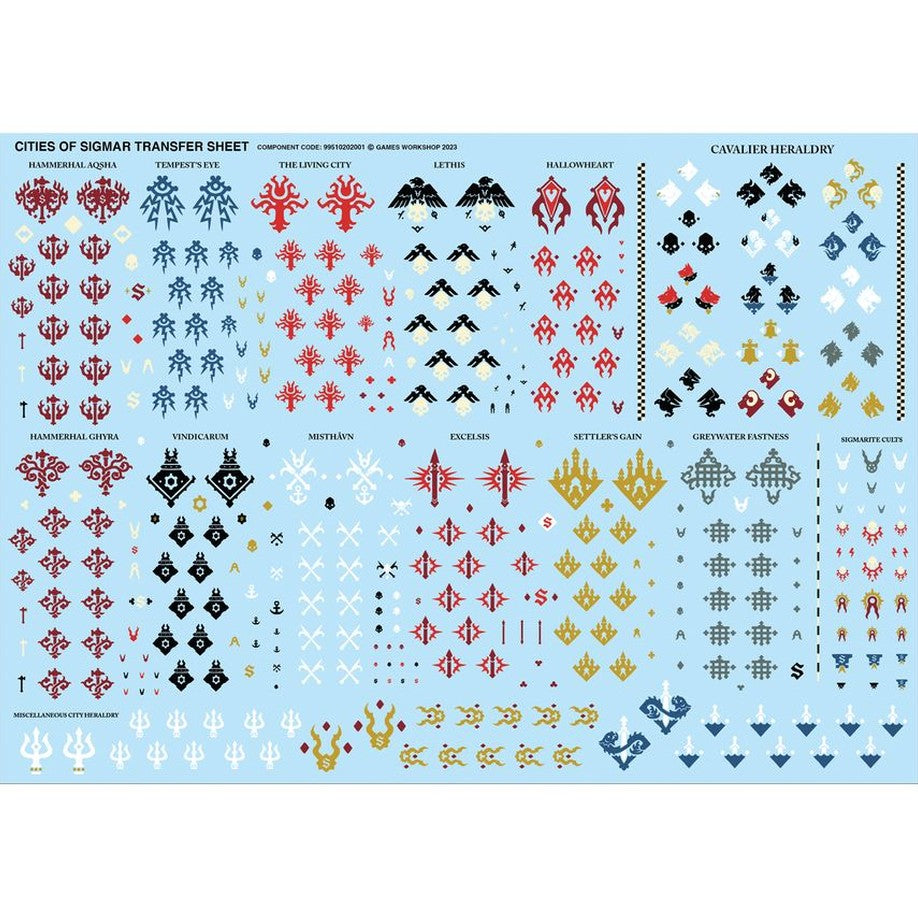 This kit comprises 115 plastic components, and is supplied with 10x Citadel 28.5mm Round Bases and 1x Citadel 25mm Round Base. Also included is a Cities of Sigmar Transfer Sheet, featuring 410 Free City icons, Sigmarite cult sigils, and other forms of heraldry.