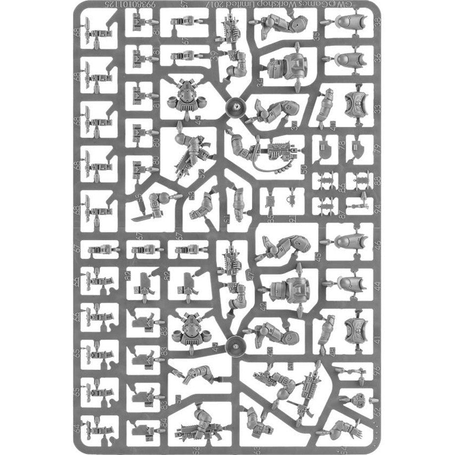 This multi-part plastic kit contains the components necessary to assemble a set of 10 Primaris Intercessors. Wearing Mk X Tacticus armour in order to take advantage of its protection and mobility, they prove to be reliable and adaptable warriors, each armed with bolt rifles. Their bolt rifles can be 1 of 3 variants – the standard bolt rifle with sickle magazine, auto bolt rifle with overcharger and box magazine, or stalker bolt rifle with longer-range sight and straight magazine. There are 16 right-hand shoulder pads decorated with the iconography of the Intercessors – enough to cover each of the variant arms, including 2 with an open radio panel, 2 gesturing for their squad to halt, 2 holding combat knives and 2 firing bolt pistols. There are a total of 24 different heads available in this kit, covering helmeted and bare options.