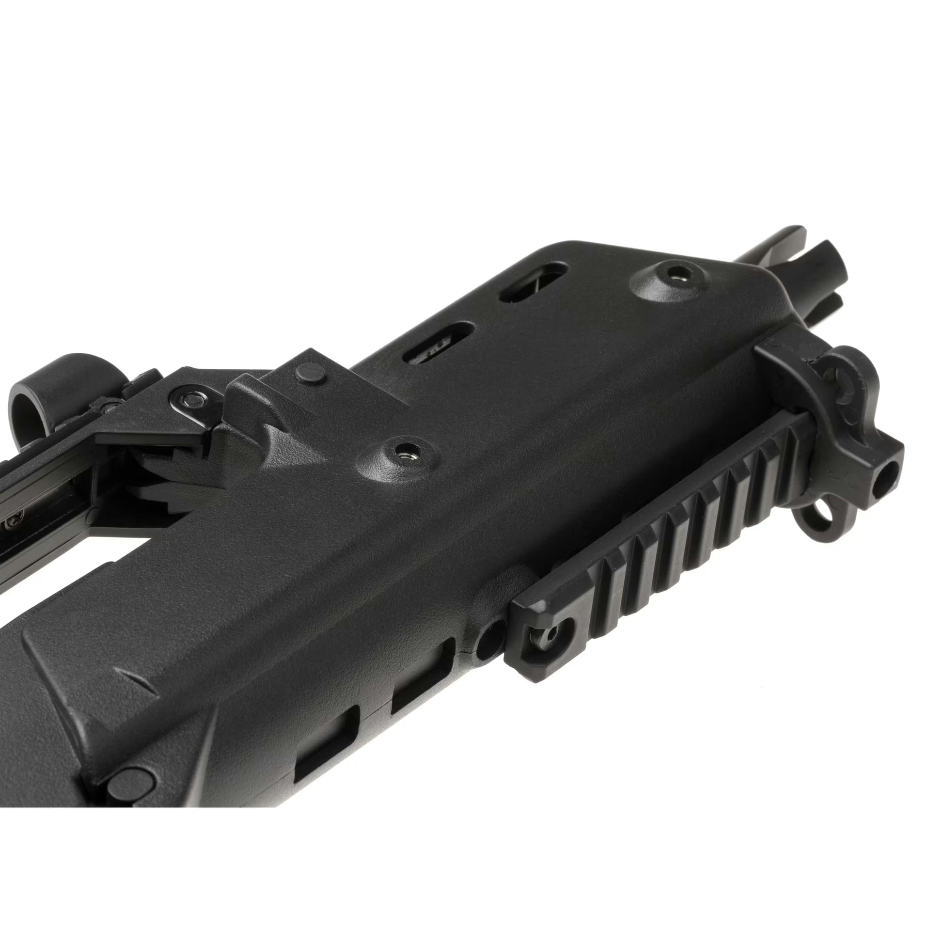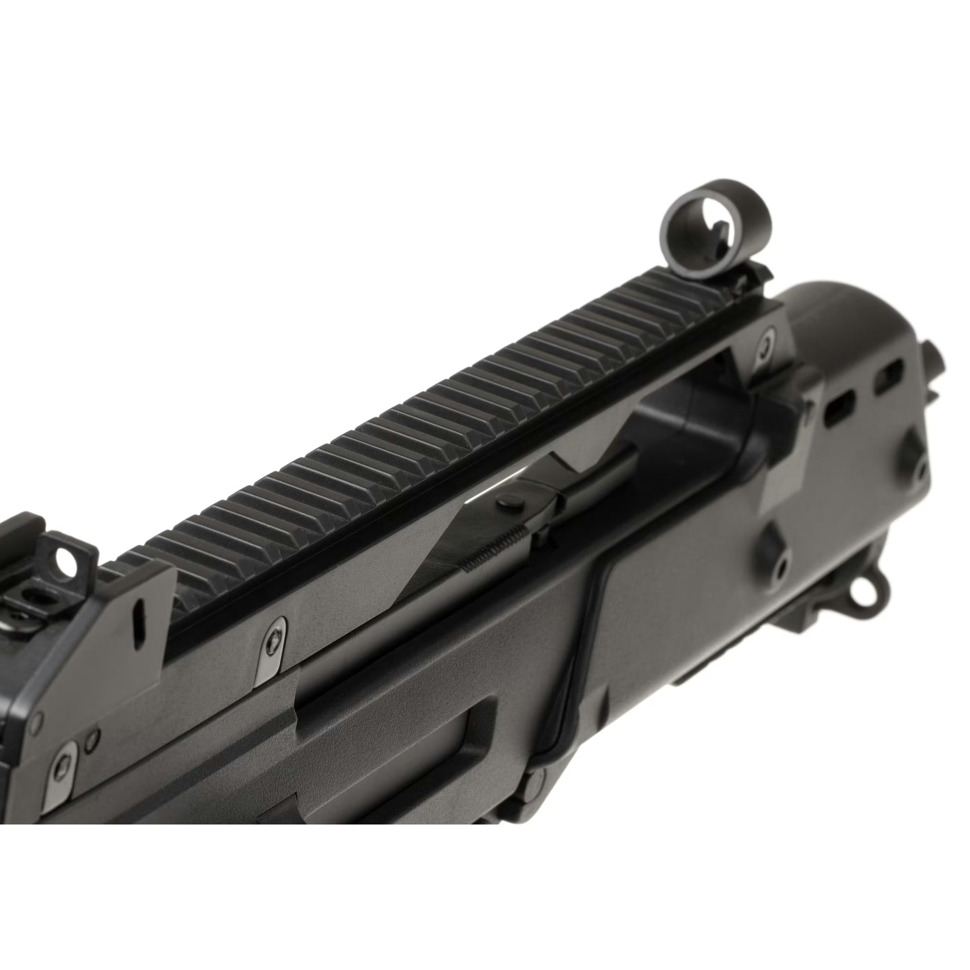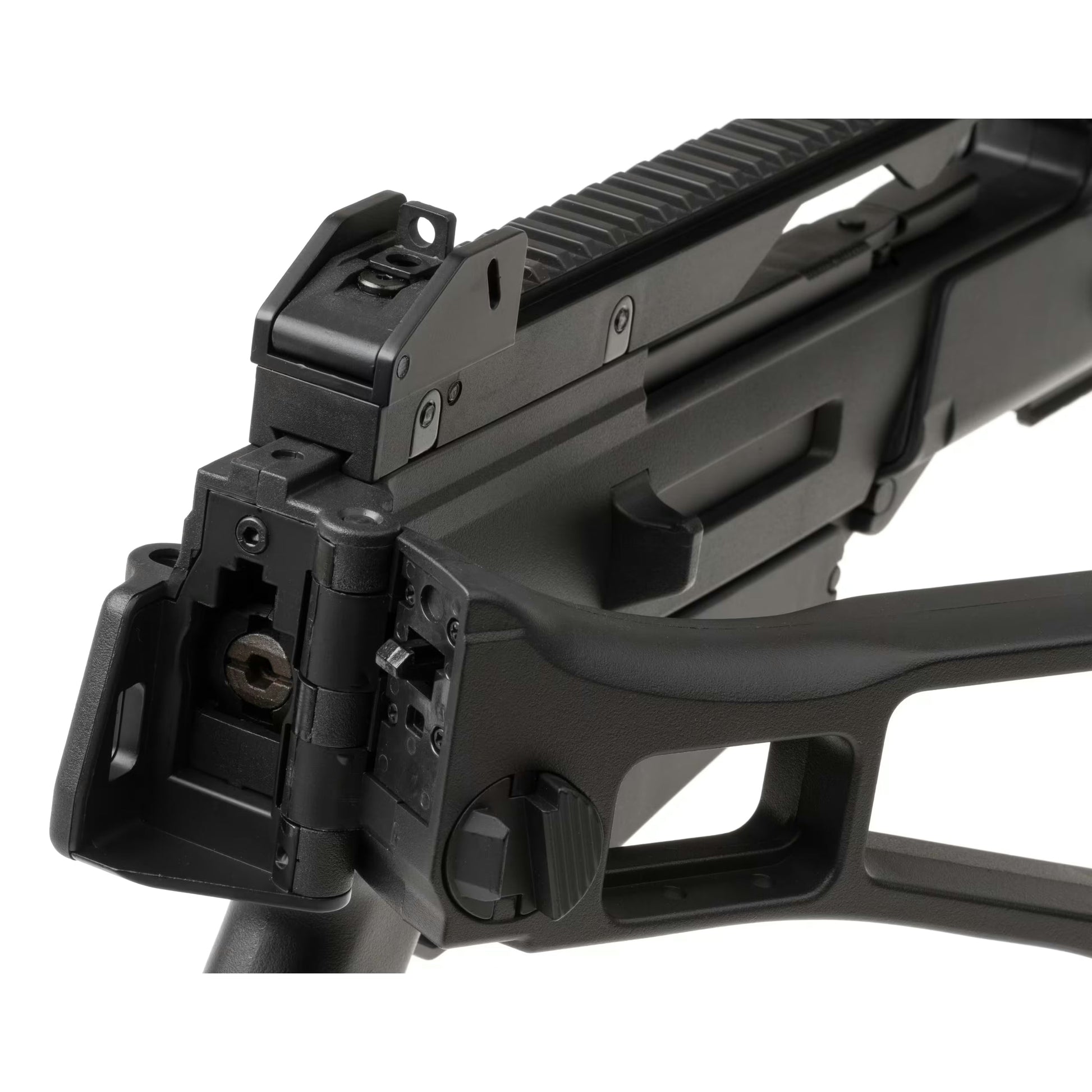 This 700/850mm long replica is fed from a hicap magazine, weighs around 2600g, and shoots in a semi and full-automatic from a 256mm long inner barrel. At the front, we can find a polymer handguard with a RIS system paired with a rail at the top. This setup allows users to attach different accessories suitable to their preference or mission requirements. The barrel is outfitted with 14 mm CCW thread and can take a multitude of various muzzle devices. The foldable buttstock is comfortable to use and helps with quick target acquisition.