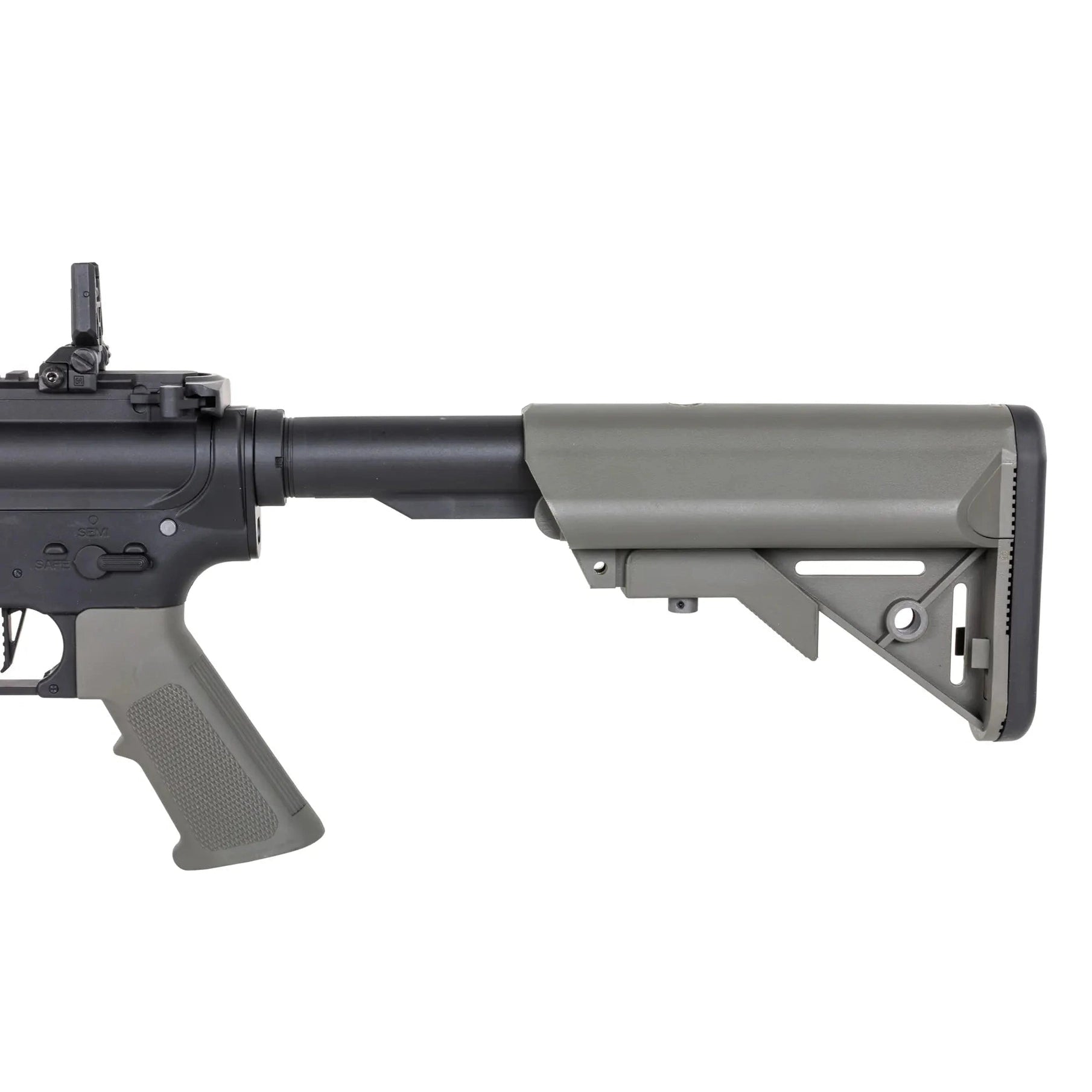 The replica is equipped with a front M-LOK rail and an adjustable buttstock. A folding sight has been fitted on the upper RIS rail, which does not interfere with the optoelectronic aiming devices. Thanks to the extendable buttstock finished with an anti-slip textured foot, it is possible to adjust the length of the replica to the build and the shooter's preferences. The standard flame suppressor is mounted on a 14-mm left-hand thread, which makes it possible to attach a sound suppressor in its place.