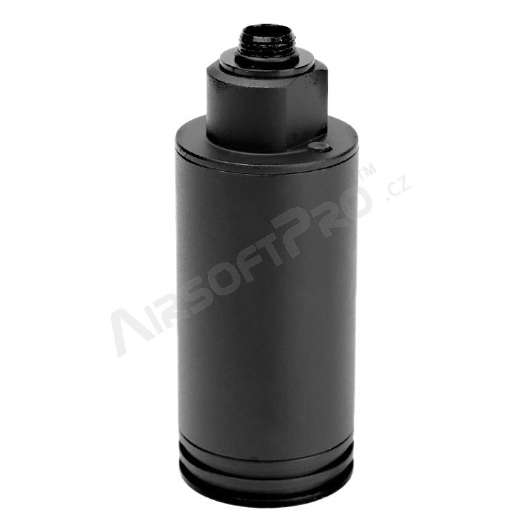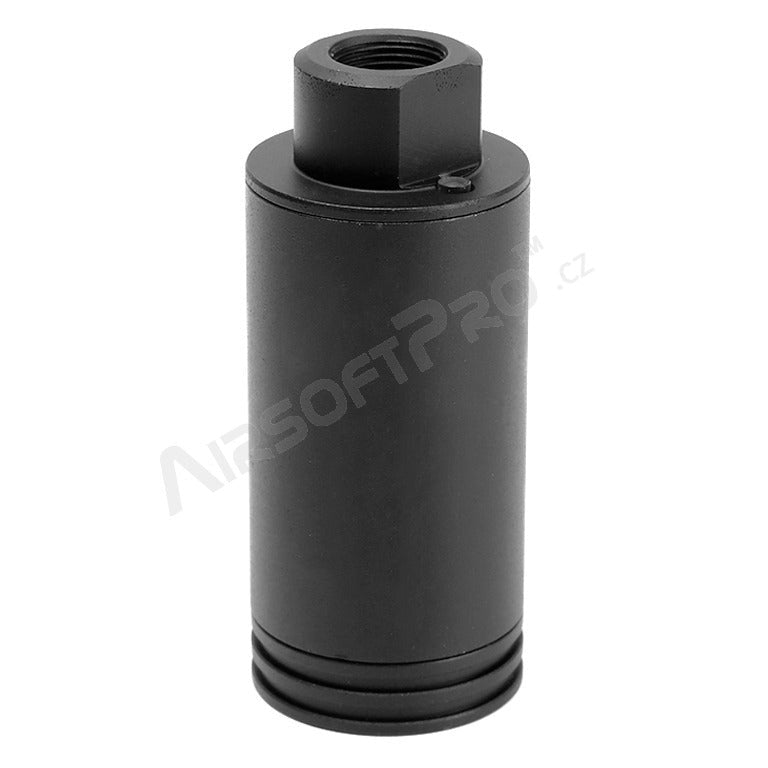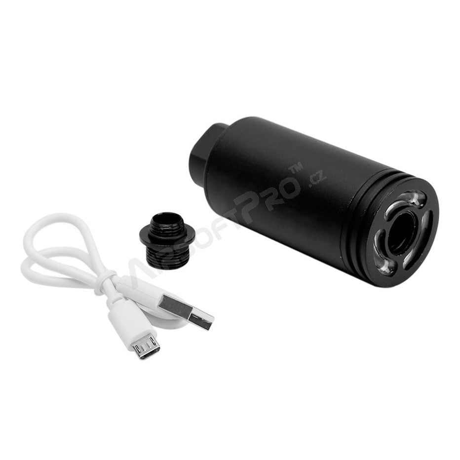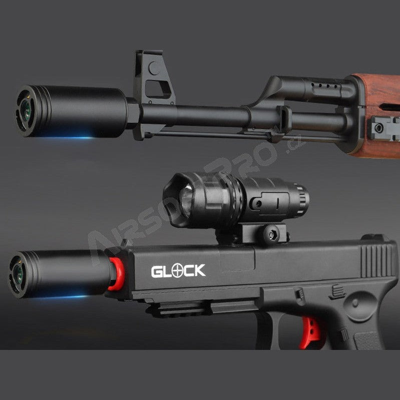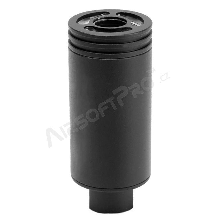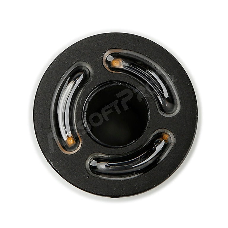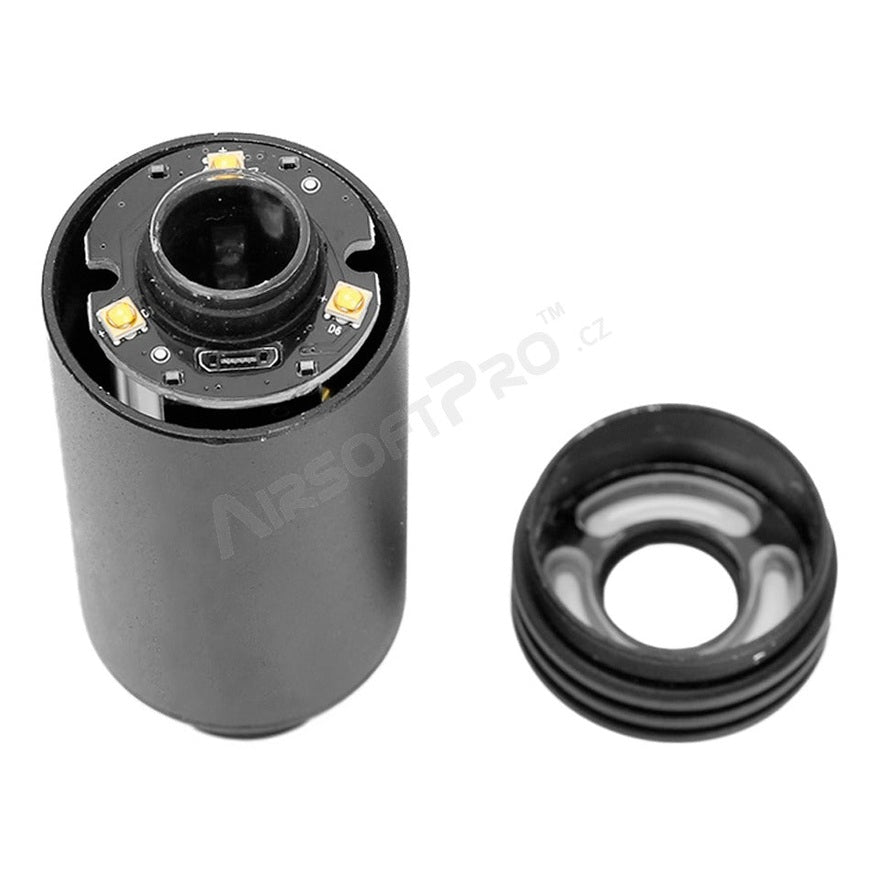 The tracer unit is housed in a matt anodised aluminium housing and is waterproof. It is powered by a replaceable 3.7 V 300 mAh Li-Ion battery. The silencer has an M14- thread. Thanks to the standard thread, it can be used on the vast majority of airsoft guns with unscrewable compensator. Included in the package is an adapter for 11 mm pistol threads, so you can use the silencer on any weapon.