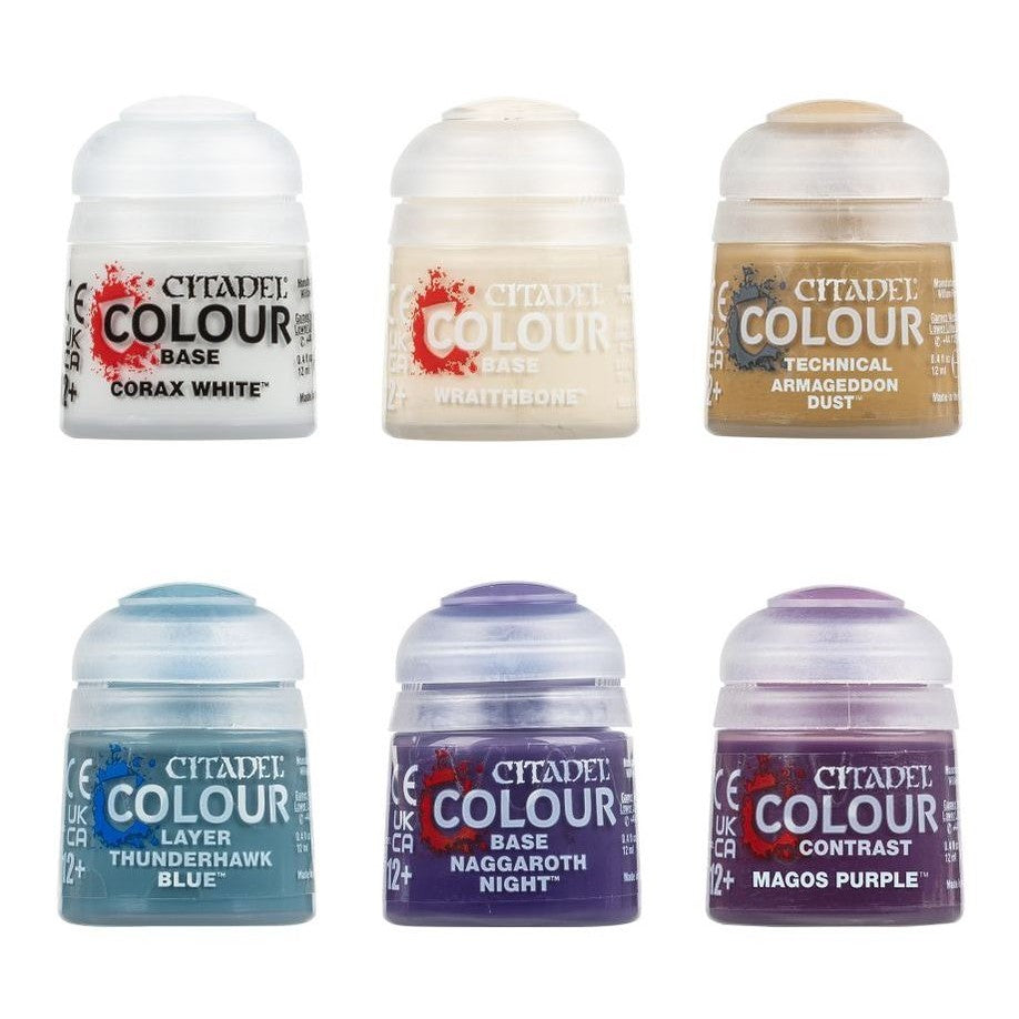 The six Citadel Colour paints are supplied in 12ml pots and feature the essential colours needed to paint the miniatures in the colours of Hive Fleet Leviathan, as well as a Technical paint to create textured bases: